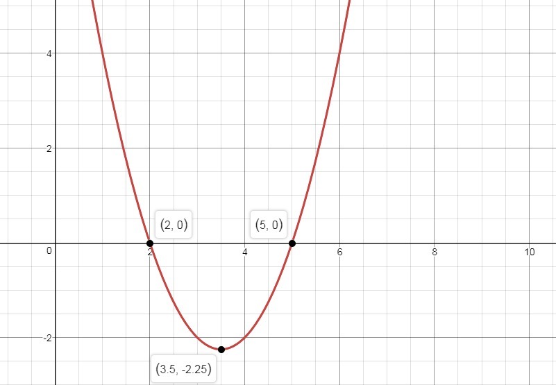 Thus the x-intercept of our polynomial are 2 and 5. Since the polynomial is of degree 2 and has positive leading coefficient, its shape will be a parabola opening in upward direction. The graph will have a minimum point but no maximum if the domain is not specified. The minimum points occurs at the midpoint of the two x-intercepts. So the minimum point will occur at x=3.5. Using x=3.5 the value of the minimum point can be found. Using all this data a rough sketch of the polynomial can be constructed. The figure attached below shows the graph of our polynomial.